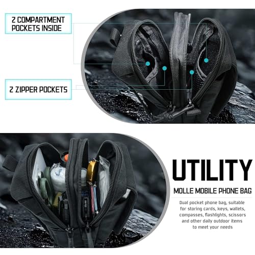 Molle Dual Phone Pouch, Tactical Admin Pouch Small, Heavy Duty Belt 1000D Nylon Small Cell Phone Case Holder, Fits 4.0-6.7 inch Screens, Black (Black)